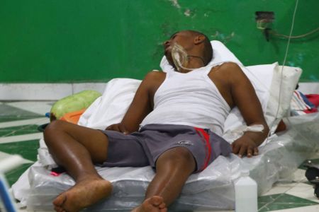 An injured man lies on a stretcher after a 7.2 magnitude earthquake struck the country on August 14, 2021, in Jeremie, Haiti.