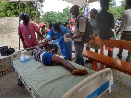 Injured people are treated in a field hospital after a 7.2 magnitude earthquake struck the country on August 14, 2021, in Jeremie, Haiti.