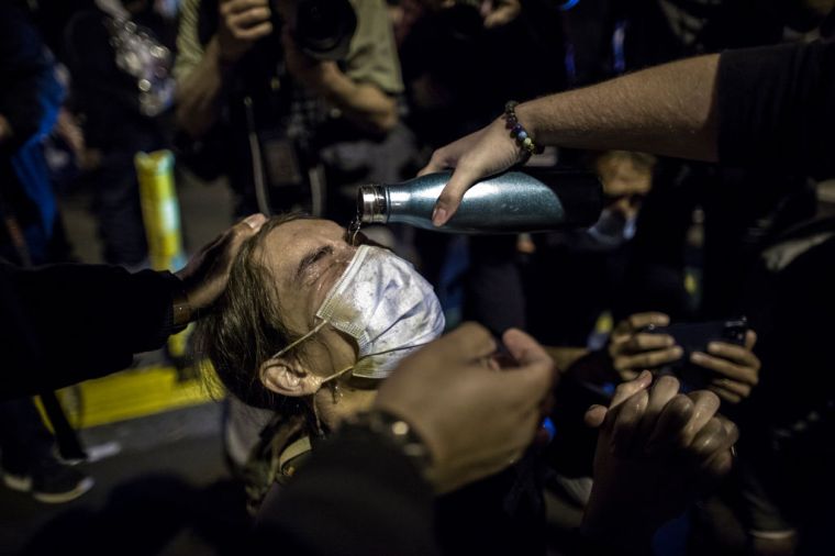 An anti-Trump demonstrator has her eyes rinsed after police used tear gas to push a crowd back near a local hotel in the area of Black Lives Matter Plaza.
