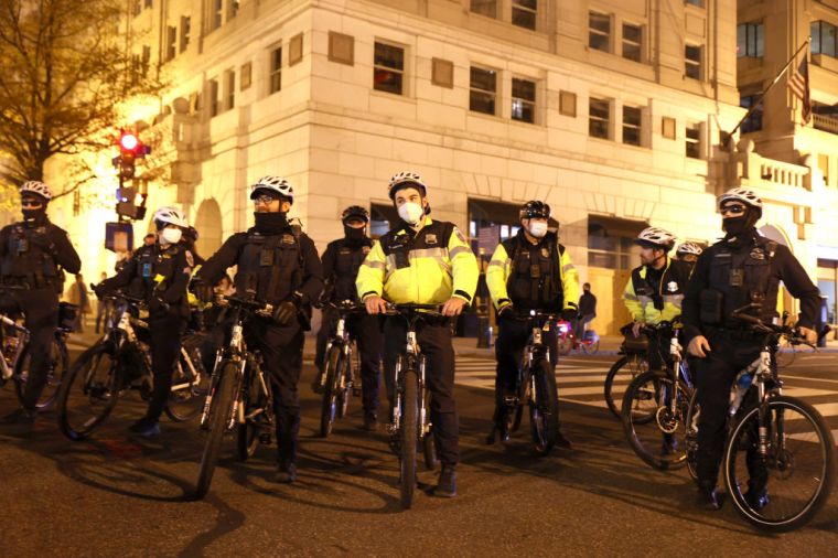 Police officers on bicycles monitor a protest following the “Million MAGA March” from Freedom Plaza to the Supreme Court.