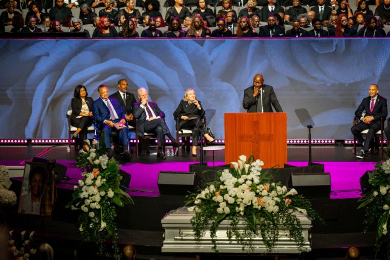 HOUSTON, TEXAS – AUGUST 01: Former President Bill Clinton, Secretary Hilary Clinton, and Rev. Jesse Jackson stand among elected officials while honoring Congresswoman Sheila Jackson Lee during her funeral service at the Fallbrook Church on August 01, 2024 in Houston, Texas. Members of the community and elected officials gathered to honor the life of the late U.S. Rep. Sheila Jackson Lee. Vice President Kamala Harris among other elected officials are expected to be in attendance for the funeral, where she will deliver remarks and the eulogy. (Photo by Brandon Bell/Getty Images) color image,photography,horizontal,usa,texas,houston – texas,politics,funeral,gulf coast states,politician,bill clinton,hillary clinton,jesse jackson sr.,sheila jackson-lee,politics and government,member of congress