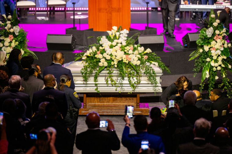HOUSTON, TEXAS – AUGUST 01: U.S. Vice President Kamala Harris pays her respects to the family of Congresswoman Sheila Jackson Lee after giving the eulogy during the funeral service at the Fallbrook Church on August 01, 2024 in Houston, Texas. Members of the community and elected officials gathered to honor the life of the late U.S. Rep. Sheila Jackson Lee. Vice President Kamala Harris among other elected officials were in attendance for the funeral, where she will delivered remarks and the eulogy. (Photo by Brandon Bell/Getty Images) color image,photography,horizontal,usa,texas,houston – texas,politics,vice president,funeral,gulf coast states,sheila jackson-lee,politics and government,kamala harris,eulogy,member of congress