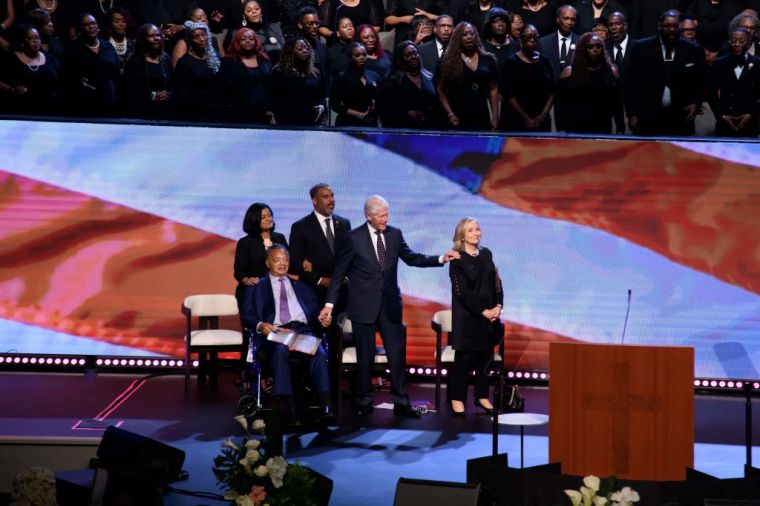 (L-R) Jesse Jackson, former US president Bill Clinton and former secretary of state Hillary Clinton listen as the Fallbrook Church choir performs “God Bless America” at the funeral of Sheila Jackson Lee in Houston, Texas, on August 1, 2024. Jackson Lee, a Democrat and outspoken advocate for racial justice and minorities’ rights, died July 19, 2024, at the age of 74. (Photo by Mark Felix / AFP) (Photo by MARK FELIX/AFP via Getty Images)