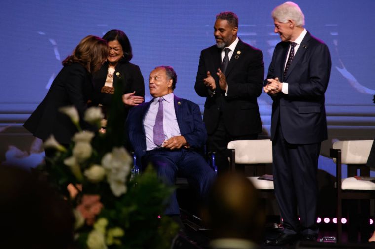 US Vice President and 2024 Democratic presidential candidate Kamala Harris (L) greets Jesse Jackson (3rd L) at the funeral of US Representative Sheila Jackson Lee at Fallbrook Church in Houston, Texas, on August 1, 2024. Jackson Lee, a Democrat and outspoken advocate for racial justice and minorities’ rights, died July 19, 2024, at the age of 74. (Photo by Mark Felix / AFP) (Photo by MARK FELIX/AFP via Getty Images)