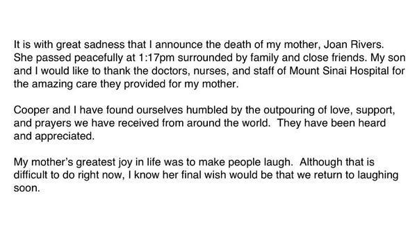 Legendary comedienne Joan Rivers “remains on life support,” her daughter said on Tuesday. “On behalf of my mother and our family, we are extremely grateful…