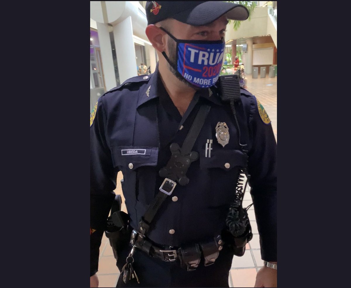A photo of an on-duty police officer in full uniform was going viral because the cop was wearing a pro-Donald Trump mask at a polling place in Florida as voters were casting their ballots early.